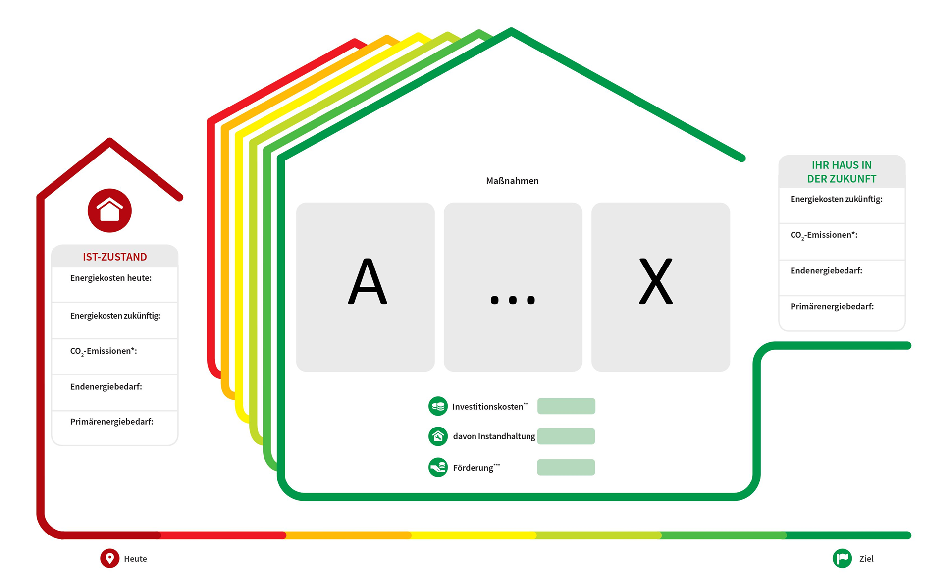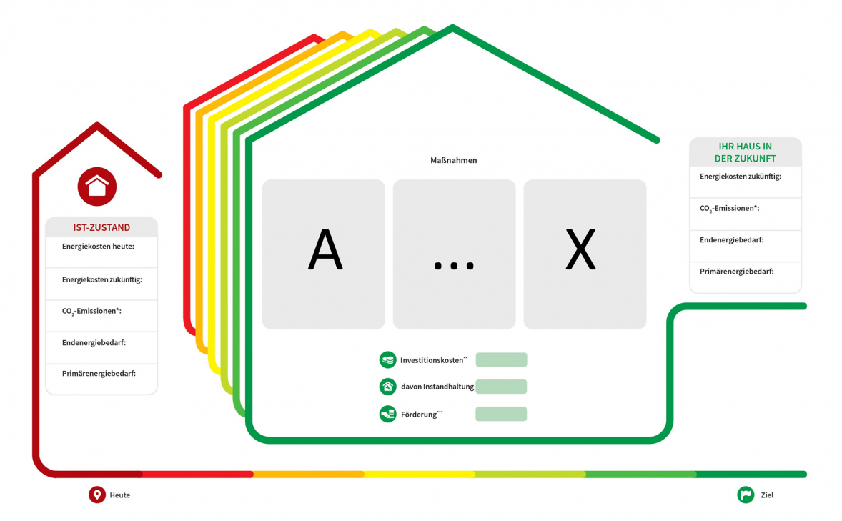 Unsere Energieberatung betrachtet Ihr Gebäude als Ganzes vom Keller bis zum Dach. Dabei werden relevante und notwendige Nutzungsparameter wie auch Ihre Gedanken zu möglichen Umbauten, Optimierungen, anstehenden Sanierungen etc. berücksichtigt. Der Gebäude- Anlagen und Systemzustand wird durchleuchtet und bewertet. Alle diese Informationen fließen in ein digitales Modell Ihres Gebäudes ein. Am Ende steht ein bewertbares digitales Modell dar dessen Zustand in sogenannte Energieeffizienzklassen ausgedrückt wird.